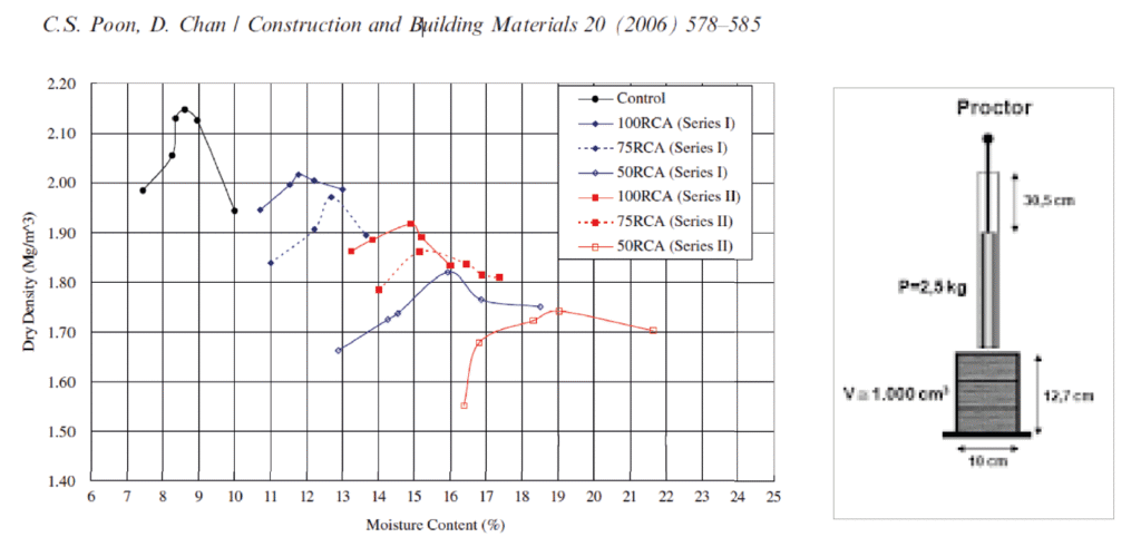 É utilizado o ensaio de Proctor em energia normal, padronizando a altura de queda do cilindro de 2,5 kg (Figura 18). A massa específica seca máxima e a umidade ótima mudam em função do tipo de AR usado. Em campo, a massa específica obtida na compactação é comparada com a do ensaio de laboratório, devendo atingir, no mínimo, o mesmo valor, ou seja, 100% do valor previsto pelo ensaio.